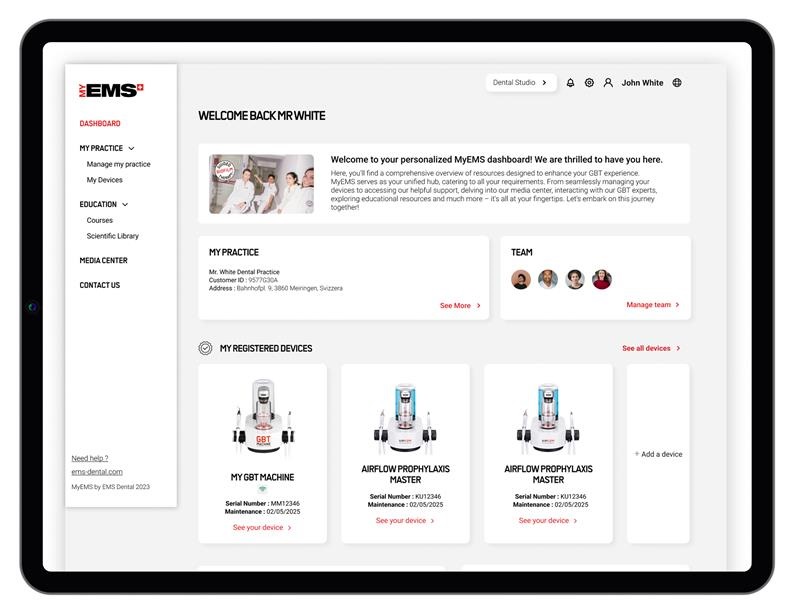 Die intuitive Benutzeroberfläche, die automatische Handstückerkennung und der standardisierte GBT-Modus ermöglichen eine einfache Bedienung, einen optimierten Arbeitsablauf sowie eine minimalinvasive Behandlung. Dank einer smarten Connectivity-Funktion lassen sich Behandlungs- und Gerätedaten über das MyEMS-Dashboard einsehen.