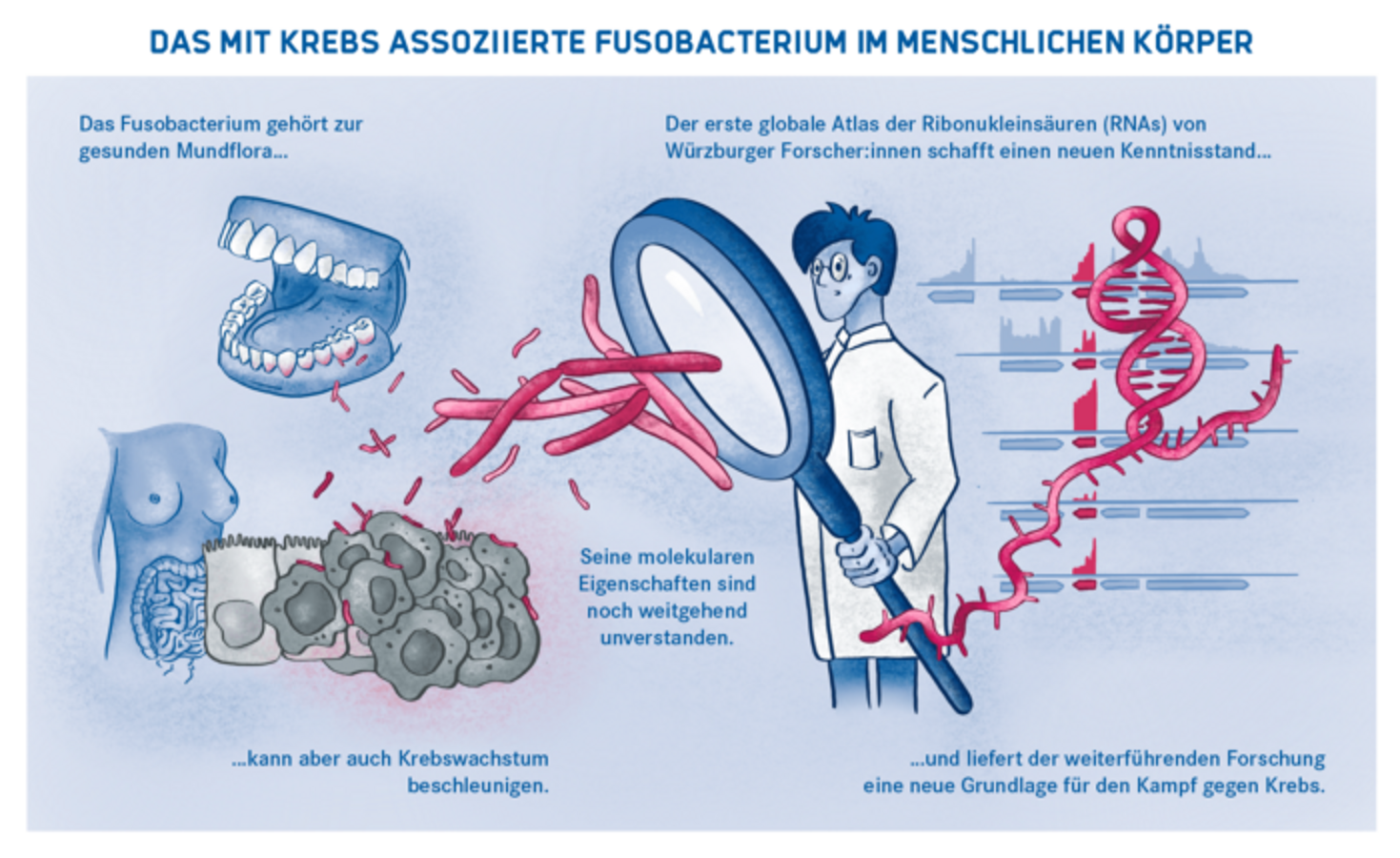 Für die künftige Therapie von Krebserkrankungen stellt die Kartografierung des Fuso-Transkriptoms eine wichtige Grundlage dar. Auf ihrer Basis könnten in einem nächsten Schritt Gene identifiziert werden, auf die eine Behandlung zielen kann, um das Fusobacterium in Karzinomen zu beseitigen und das Krebswachstum einzudämmen.