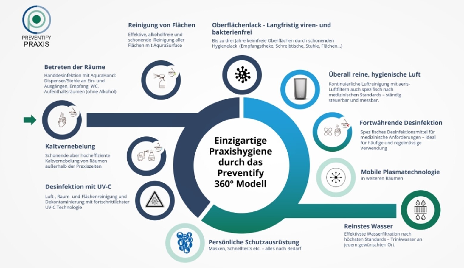 Seit Beginn der Pandemie ist das allgemeine Bewusstsein und Bedürfnis nach Hygiene, Prävention und Schutz in allen Lebens- und Arbeitsbereichen deutlich angestiegen. Preventify ist aus den Erfahrungen der vergangenen eineinhalb Jahre entstanden und bietet Lösungen für zukünftige Herausforderungen in der modernen Praxis und Gesundheitseinrichtungen. Preventify bietet umfassenden Schutz für medizinisches Personal sowie Patientinnen und Patienten, um sicheres Arbeiten mit gutem Gefühl möglich zu machen.