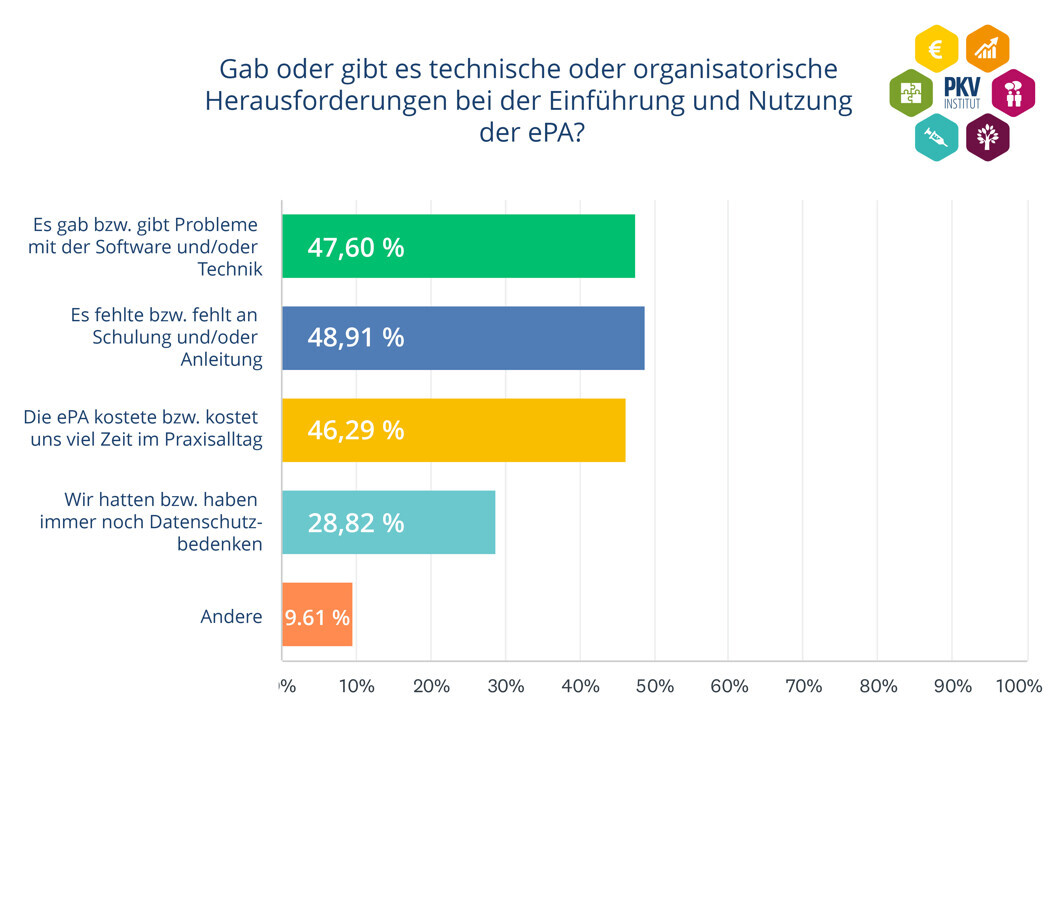 Begründet wird die momentan eher kritische Wahrnehmung der ePA unter anderem mit dem Aufwand beim Befüllen, umständlichen Prozessen, unpraktischer Bedienung mit zu vielen Klicks, unvollständigen Akten, instabilem Datenabruf und zu hohem Zeitaufwand bei gleichzeitigem Personalmangel in der Praxis. Auch die Regelungen zur Vergütung der Befüllung der ePA werden kritisiert. Der Zugriff auf die ePA sei manchmal nicht möglich, teilweise seien Versichertenkarten trotz Einwilligung der Patientinnen und Patienten nicht für die ePA freigeschaltet. Viele Praxen hatten einen schlechten Start mit der ePA: 47,6 % berichten von Problemen mit Software und Technik, 48,9 % beklagen fehlende Schulung und Anleitung fürs Praxisteam. 46,3 % beklagen, dass die ePA momentan noch zu viel Zeit kostet. Nur 1,7 % gaben an, keine Probleme zu haben.